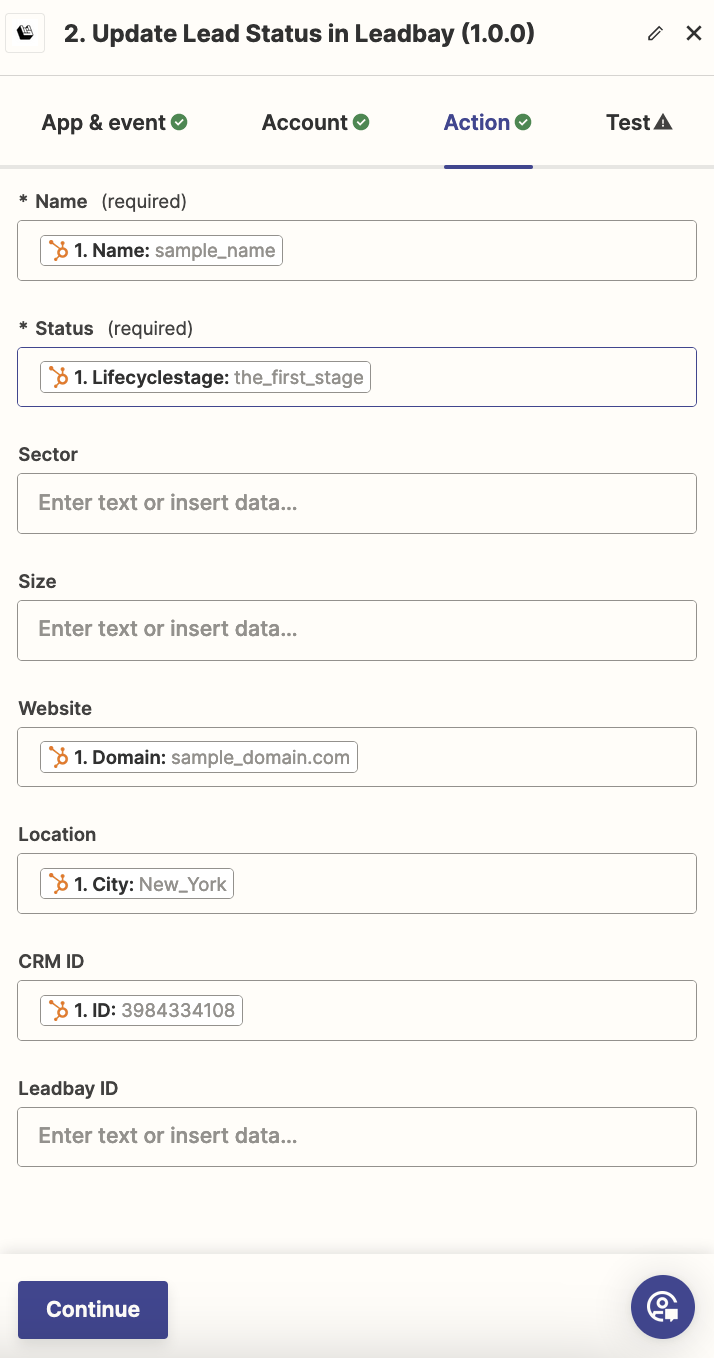 * Configurez l’association des champs entre les colonnes de votre CRM et les variables que Leadbay comprend. Plus vous associez de champs, mieux Leadbay pourra faire correspondre les données de votre CRM avec les entreprises que les modèles de Leadbay connaissent. Cliquez sur Continuer.