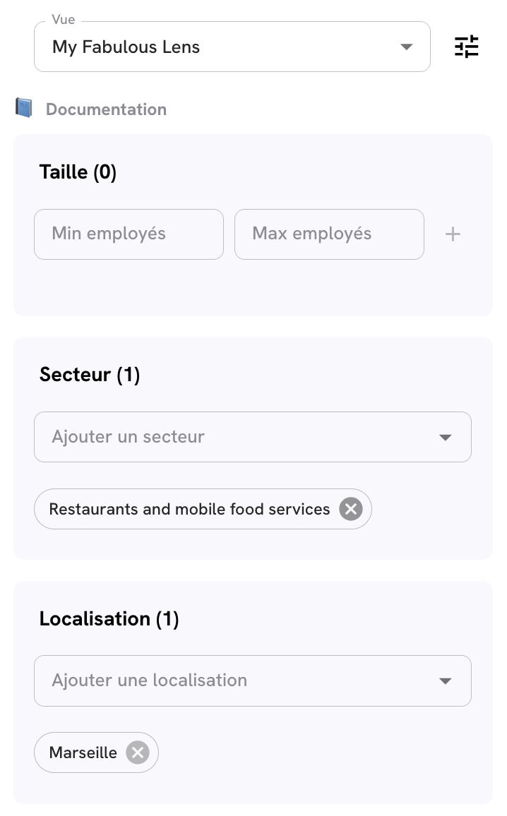 Tout ce que Leadbay sait sur un lead peut potentiellement être un critère que vous pouvez utiliser pour filtrer les leads. Par exemple, Localisation : Paris, Taille : 50-100, ou Secteur : Services financiers.