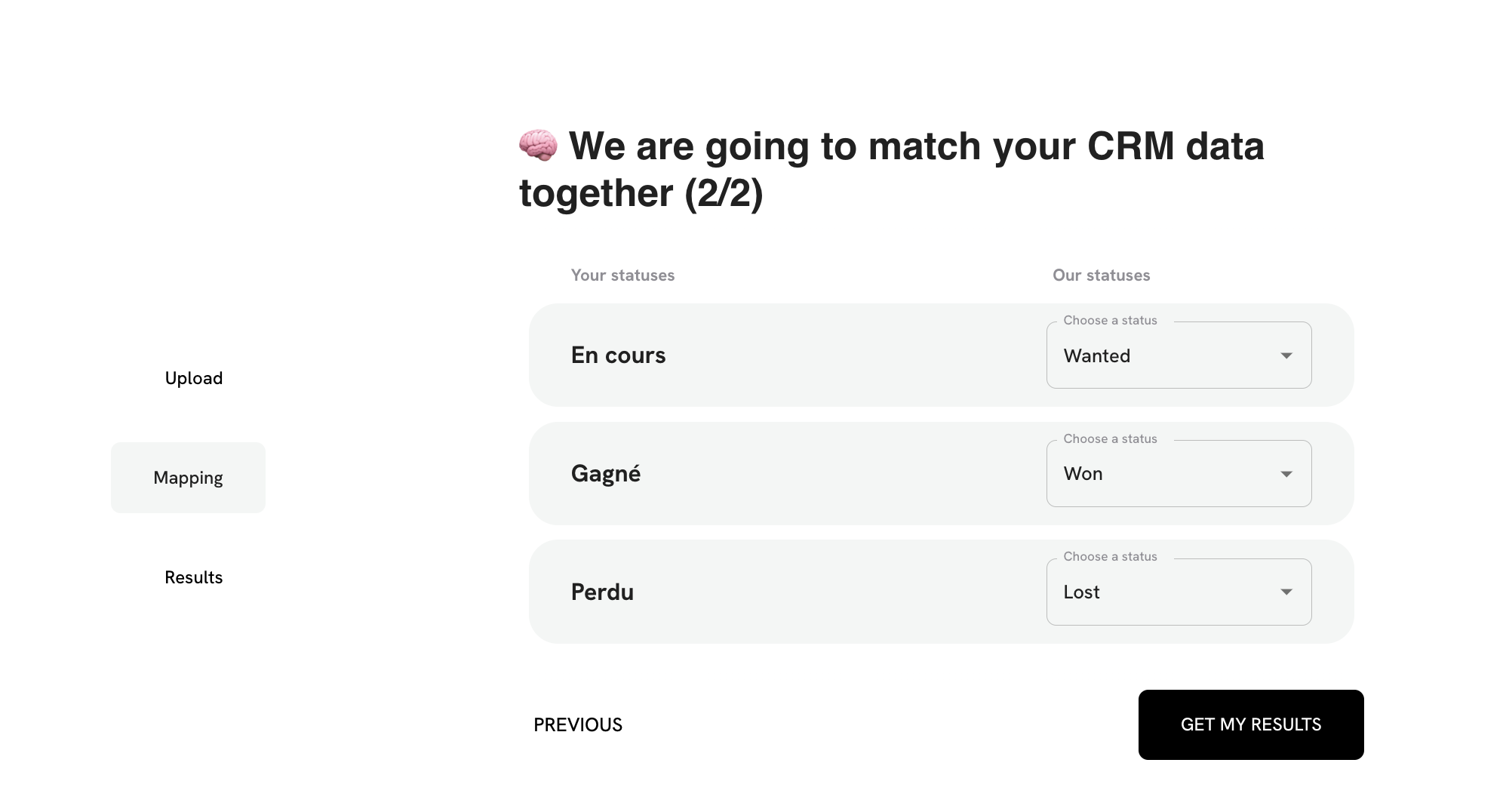 Chaque CRM utilise des noms différents pour les mêmes informations, nous aurons donc peut-être besoin de votre aide pour comprendre ce qui correspond à quoi. Notre IA fera une estimation éclairée et nous vous demanderons de vérifier ou corriger l’association des champs.