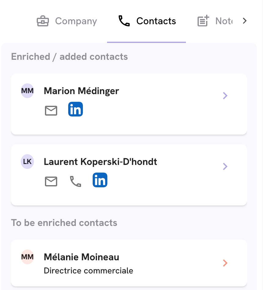 Ces suggestions apparaissent dans la section « Contacts à enrichir ». Vous pouvez les enrichir en un clic. Une fois enrichis, ils passent dans « Contacts enrichis / ajoutés » avec leurs :